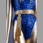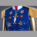 DescriptionThis vintage sequined marching band unitard was famously worn by pop artist Chappell Roan in the 2023 music video for her hit single "Hot To Go!" from her debut album, The Rise and Fall of a Midwest Princess. The ensemble features a blue and gold color scheme, complete with a gold belt, red and silver stripes, and epaulettes, embodying a French-military-inspired aesthetic.
